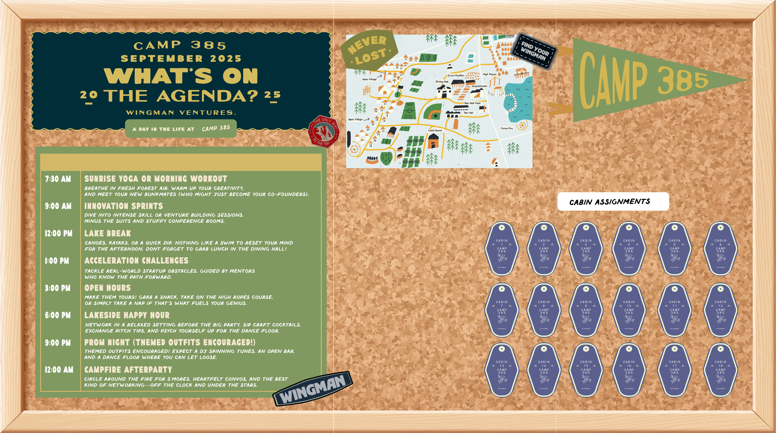 Welcome to Camp 385—the world’s first (and only) week-long summer camp slash startup accelerator that swaps boardrooms for bunk beds and pitches for campfire chats. We’re talking 7 days of intense, investor-ready training, balanced with lakeside games, and cocktails under the stars. Because let’s face it: traditional accelerators can be boring AF.